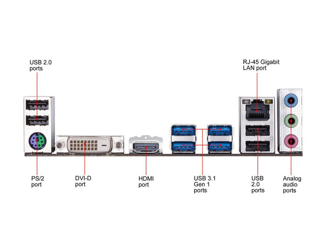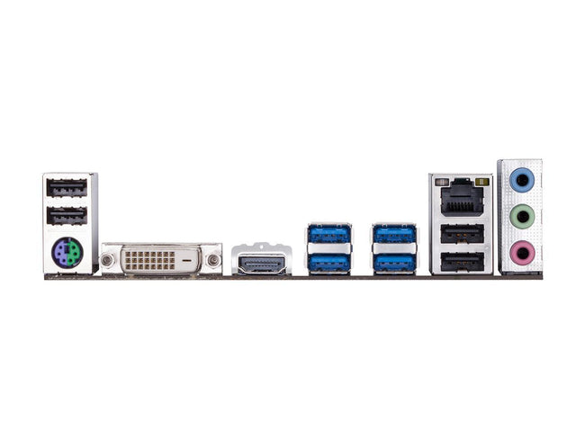 | Back I/O Ports | 1 x PS/2 keyboard/mouse port 1 x DVI-D port 1 x HDMI port 4 x USB 3.1 Gen 1 ports 4 x USB 2.0/1.1 ports 1 x RJ-45 port 3 x audio jacks |