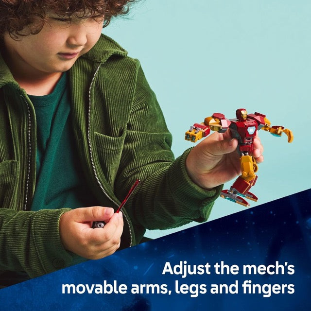 The fully jointed mech has movable arms, legs and fingers and the torso opens to reveal a cockpit for the Iron Man minifigure.