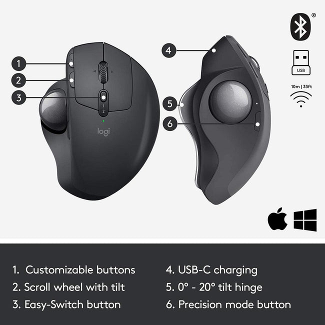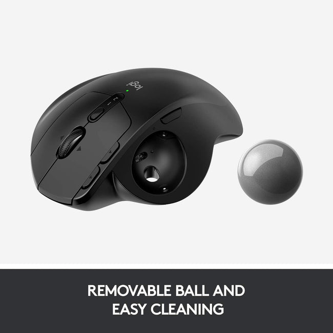 - Logitech Mouse MX Ergo Wireless Trackball Mouse, Adjustable Ergonomic Design, Control and Move Text/Images/Files Between 2 Windows and Apple Mac Computers (Bluetooth or USB), Rechargeable - (Graphite)