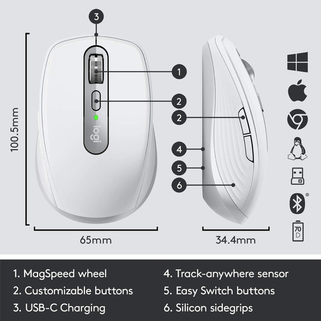 Logitech Mouse MX Anywhere 3 Compact Performance Mouse, Wireless, Comfort, Fast Scrolling, Any Surface, Portable, 4000DPI, Customizable Buttons, USB-C, Bluetooth - (Pale Grey)