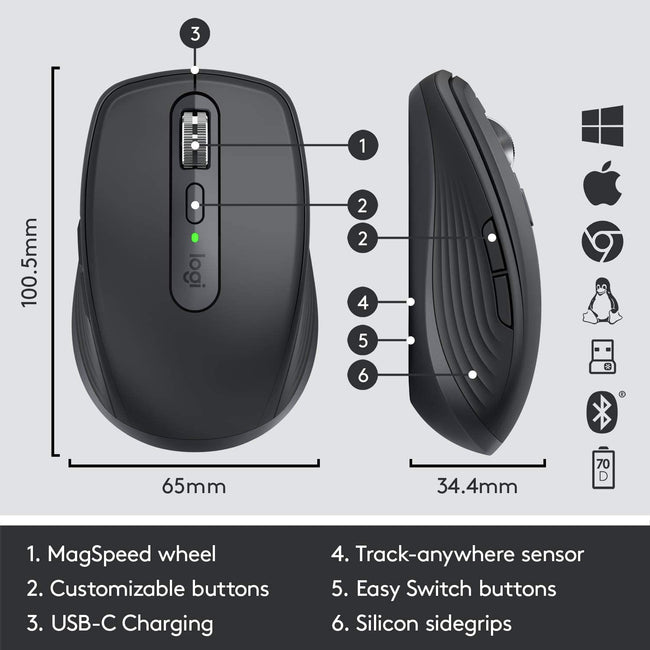 Logitech Mouse MX Anywhere 3 Compact Performance Mouse, Wireless, Comfort, Fast Scrolling, Any Surface, Portable, 4000DPI, Customizable Buttons, USB-C, Bluetooth - (Graphite)