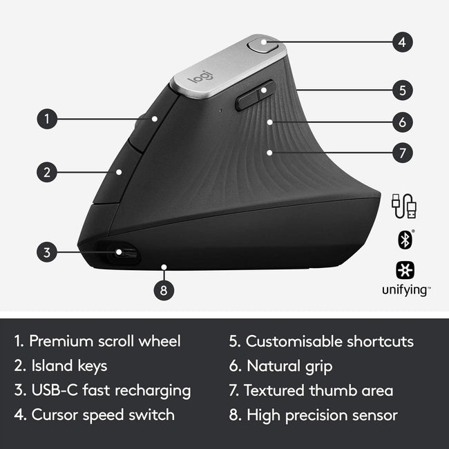 Connect MX Vertical via the included USB-C charging cable, Logitech Unifying Receiver, or Bluetooth®.