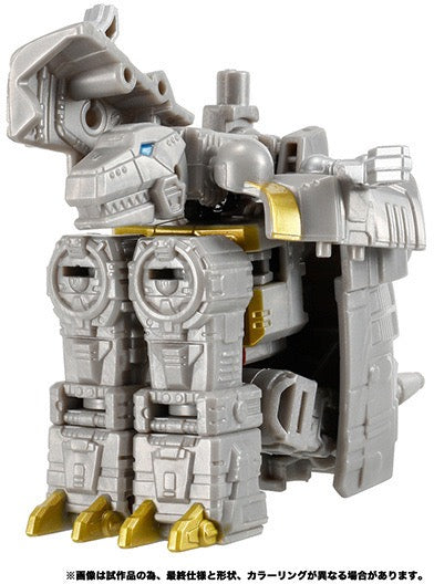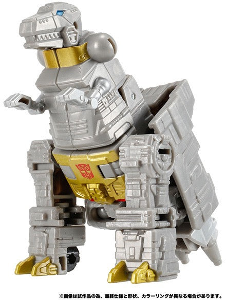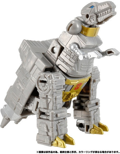 Grimlock, the commander of the Autobots and Dinobots, transforms into a Tyrannosaurus-type mechanical dinosaur! He can also combine with his fellow Dinobots to transform into the mighty Volcanicus in a new combination mode! (Other Dinobots are sold separately.) He has a double gun mounted to his tail that can also be hand-held. Order him for your own collection today!